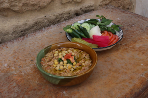 بندورة، خيار، بصل يابس، حامض، نعناع، ثوم، زيت زيتون، ملح.