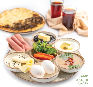 لبنة - جبنة - خضار مع زيتون - بيض مسلوق - مربى وزبدة - منقوشة زعتر وجبنة - مرتديلا - كوب شاي واختيار صنف واحد من الأصناف الآتية: فول، مسبحة، بليلة