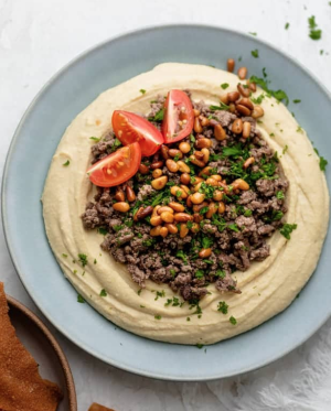 Meat Hummus with Pine Nuts حمص باللحمة مع صنوبر